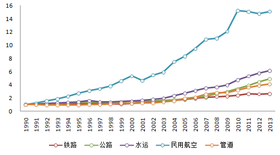 作為我國的經濟命脈,鐵路、公路、水路、民用航空、管道等運輸方式的快速發(fā)展促進了我國各區(qū)域之間的人員及貨物交流,促進了資源的合理配置。在1990-2013年間,我國各主要運輸方式在貨運量方面取得了飛速的增長,其中航空運輸?shù)呢涍\量增速最為明顯;在結構方面也在不斷調整,鐵路運輸貨運量呈現(xiàn)降低趨勢而水路運輸貨運量呈現(xiàn)上升趨勢。
