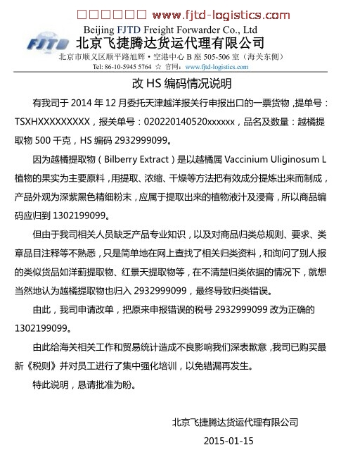 茲有我司于2014年12月委托天津越洋報(bào)關(guān)行申報(bào)出口的一票貨物,提單號(hào):TSXHXXXXXXXXX,報(bào)關(guān)單號(hào):020220140520xxxxxx,品名及數(shù)量:越橘提取物500千克,HS編碼2932999099。
