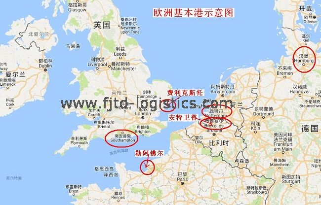 歐洲的基本港主要有6個(gè):荷蘭的Rotterdam鹿特丹;德國的Hamburg漢堡;比利時(shí)的Antwerp安特衛(wèi)普;法國的Le Havre勒阿佛爾;和英國的Felixstowe費(fèi)利克斯托以及Southampton南安普頓。
