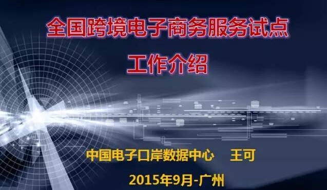 海關(guān)總署數(shù)據(jù)中心副主任王可先生在2015年9月19日廣州的中國(guó)跨境電商大會(huì)暨海貿(mào)會(huì)代表海關(guān)對(duì)跨境電商年會(huì)的支持發(fā)表演講“全國(guó)跨境電子商務(wù)海關(guān)服務(wù)詳細(xì)介紹”