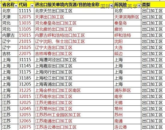 在海關(guān)《國(guó)內(nèi)地區(qū)代碼表》——境內(nèi)貨源地/目的地代碼表中,國(guó)家級(jí)出口加工區(qū)基本都是單獨(dú)列明,都有單獨(dú)的境內(nèi)貨源地/目的地代碼。比如:11115——北京天竺出口加工區(qū);12075——天津出口加工區(qū);37025——山東青島出口加工區(qū);31225——上海金橋出口加工區(qū)南區(qū);32055——江蘇蘇州工業(yè)園區(qū)加工區(qū);32235——江蘇昆山出口加工區(qū);35015——福建福州、福清出口加工區(qū);44035——廣東深圳出口加工區(qū);44235——廣東南沙出口加工區(qū);44015——廣東廣州出口加工區(qū);45055——廣西北海出口加工區(qū);61015——陜西西安出口加工區(qū)等。