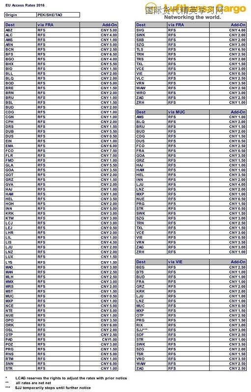 附:LH漢莎航空 中轉(zhuǎn)點-轉(zhuǎn)運費一覽表