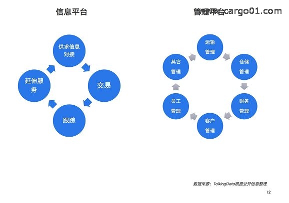 物流平臺分為兩類,信息平臺和管理平臺。信息平臺分為物流信息查詢平臺和物流信息交易平臺。查詢平臺主要以物流信息查詢和發(fā)布為主,交易平臺在查詢平臺的基礎(chǔ)上增加買賣雙方直接交易功能,并且在買賣雙方交易全程提供配套服務(wù)。 管理平臺的主體通常是企業(yè)主,管理平臺的作用主要是合理調(diào)配資源、提高效率等。