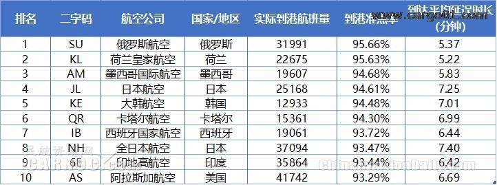 7月全球大型航空公司到港準(zhǔn)點(diǎn)率TOP10排名中,俄羅斯航空以95.66%的到港準(zhǔn)點(diǎn)率超過(guò)日本航空,成為全球最準(zhǔn)點(diǎn)的大型航空公司。日本航空則從第1位下滑至第4位。荷蘭皇家航空、墨西哥國(guó)際航空分列第2、3位。