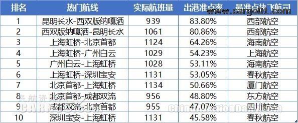 7月國(guó)內(nèi)熱門航線準(zhǔn)點(diǎn)率TOP10排名中,昆明長(zhǎng)水-西雙版納嘎灑航線出港準(zhǔn)點(diǎn)率最高,該條航線上執(zhí)飛最準(zhǔn)點(diǎn)的航司為西部航空。TOP10熱門航線中只有昆明長(zhǎng)水往返西雙版納嘎灑的準(zhǔn)點(diǎn)率保持在80%以上。