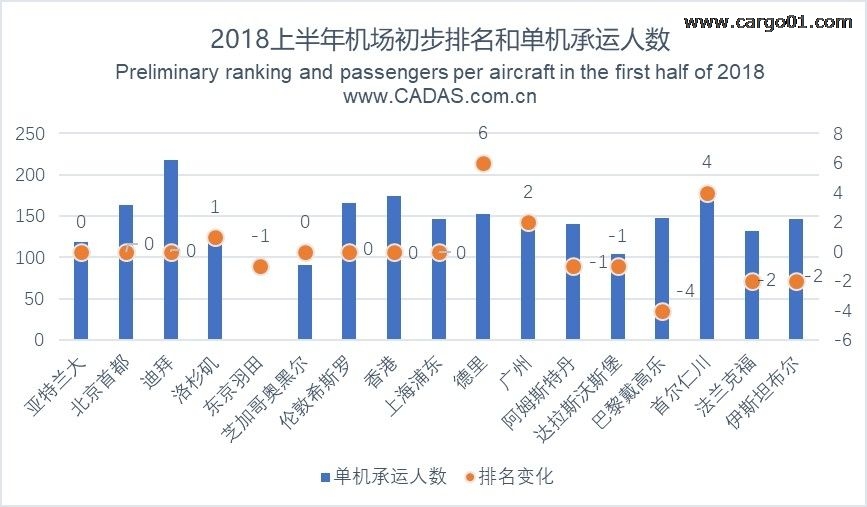 從起降架次方面觀察,德里機場飛機起降架次同樣增速最快,同比增長10.66%。旅客吞吐量最高的亞特蘭大機場的起降架次最多,其次為芝加哥奧黑爾機場。德里機場旅客吞吐量初步排名上升6位最多,由2017年第16位躋身第10位。同樣增速較快的首爾機場排名也由第19位上升第15位。而伊斯坦布爾機場旅客吞吐量同比增速達12.75%較高,但其旅客吞吐量排名由第15位下滑至第17位。法蘭克福機場旅客吞吐量排名由第14位下滑至第16位,巴黎戴高樂機場由第10位下滑至第14位,北京首都機場、香港機場、上海浦東機場仍保持2017年排名,分別位居第2、8、9位,廣州機場則由第13位上升第11位。通過觀察單機承運人數方面,迪拜機場的單機承運人數最高,其次為首爾機場、香港機場,可以看出這些機場對時刻的利用更充分(時刻發(fā)揮更大“效益”)。