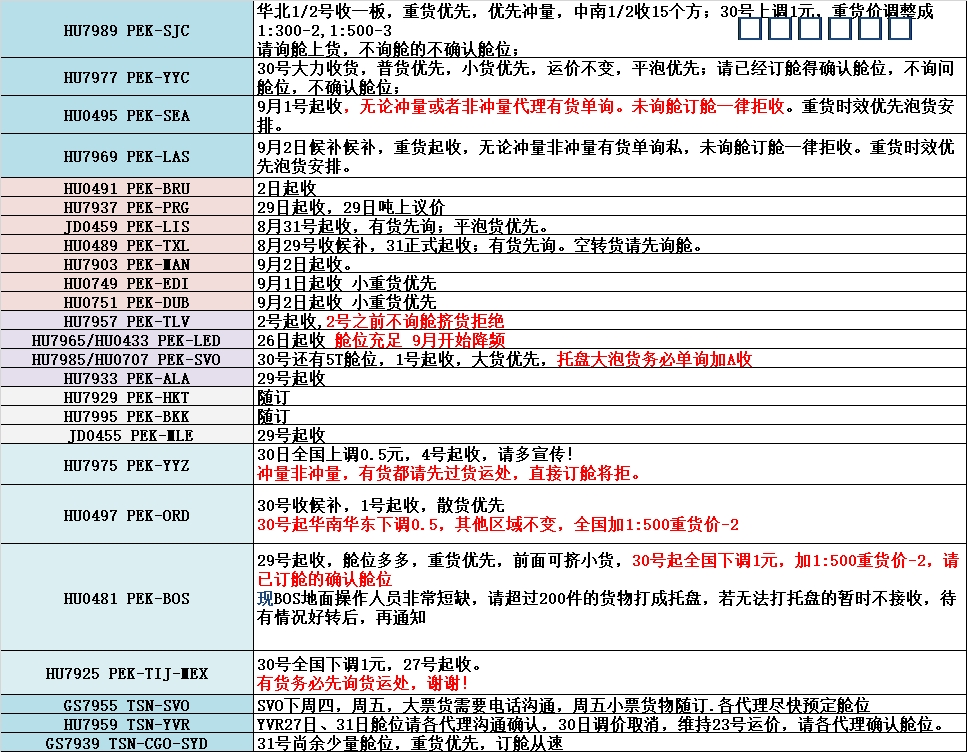 • PEK-SEA,PEK-SJC,PEK-LAS全國(guó)上調(diào)1元,重貨價(jià)調(diào)整成1:300-2,1:500-3。