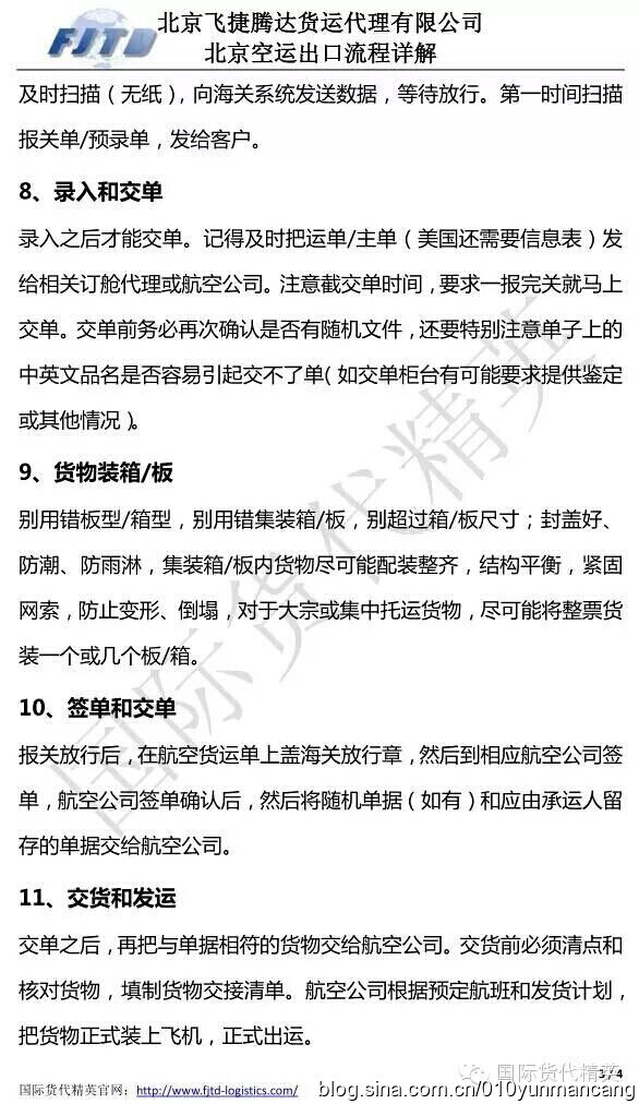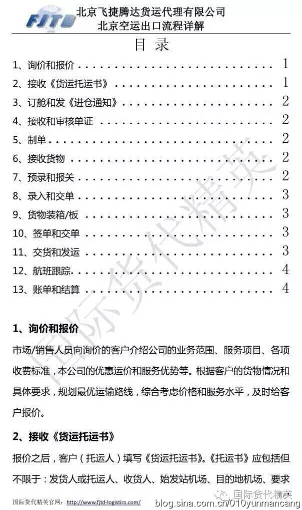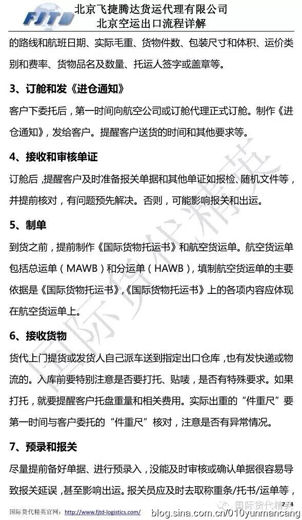 1、詢價(jià)和報(bào)價(jià)2、接收《貨運(yùn)托運(yùn)書》3、訂艙和發(fā)《進(jìn)倉通知》4、接收和審核單證5、制單6、接收貨物7、預(yù)錄和報(bào)關(guān)8、錄入和交單9、貨物裝箱/板10、簽單和交單11、交貨和發(fā)運(yùn)12、航班跟蹤13、賬單和結(jié)算